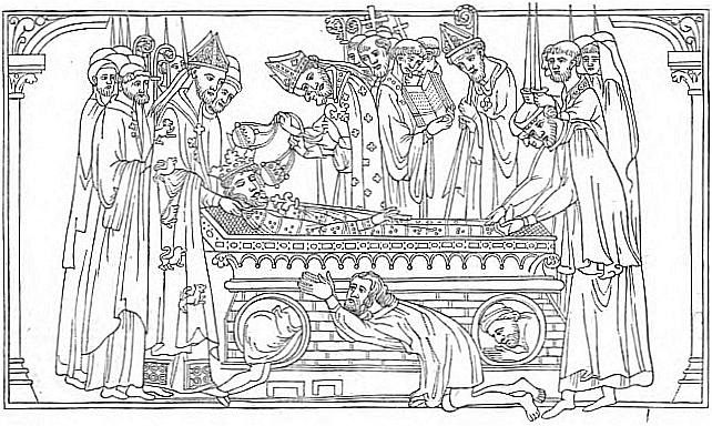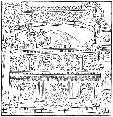 ILLUSTRATIONS—Edward naming Harold his successor, from the Cambridge MS. p. 88. Edward carried for burial to Westminster Abbey, from the Bayeux Tapestry, p. 91. Edward entombed, from the Cambridge MS., p. 92. Harold's election and coronation, from the Bayeux Tapestry, p. 99. Ship bearing the messenger with the news to William, also from the Tapestry, p. 100.