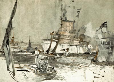 Signals were passing along the line constantly and semaphores were throwing their arms about as if they were manikins performing for the amusement of the 14,000 men afloat. It was pretty to see a mass of flags fall to the deck simultaneously from time to time. It was impressive to see the flag of the country fluttering from the gaffs of mainmasts. It was fine to see the ships keeping in line.