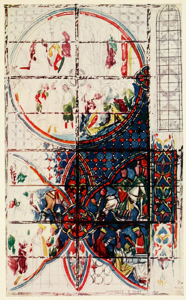 For the first part of the century, as I have said, the number of windows produced in France seems to have been few. Such events as the disaster of Agincourt, the conquest of France by Henry V., and its deliverance by Joan of Arc can have left little money or thought for stained-glass windows. The names of the maîtres verriers of the cathedrals show that all through the time there 245 were men who carried on the tradition, but their output seems to have been small. What windows they have left us do not show the same complete change from the work of the previous century that we find in England; the style did not as in England crystallize into a definite form, but remained as a transitional style between that of the fourteenth and late fifteenth centuries. In its general outlines the design did not at first differ greatly from that of the fourteenth century, but, as in England, the white canopy touched with stain took the place of all others, and there was a general increase in the amount of white in windows. In detail, however, the canopy altered slowly, and it was never as in England reduced to an almost flat pattern by the use of strong line work, but persisted in the attempt to imitate solid stone-work.