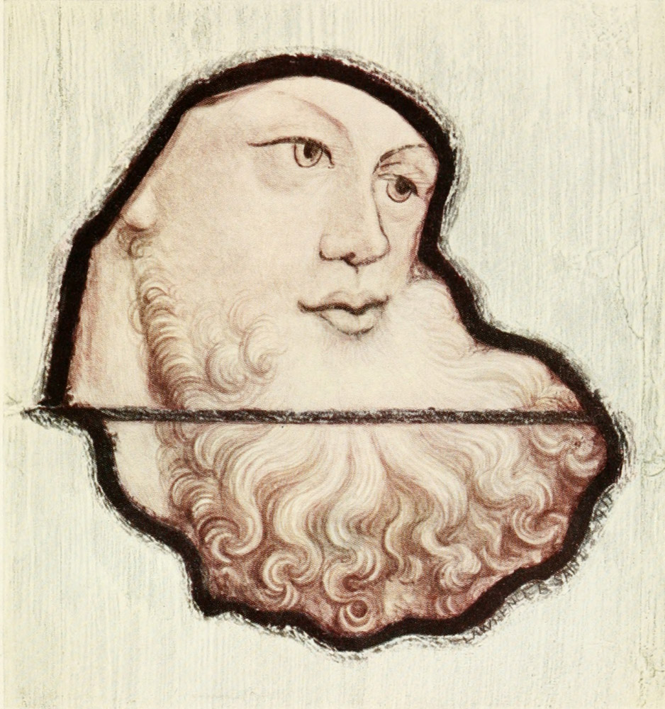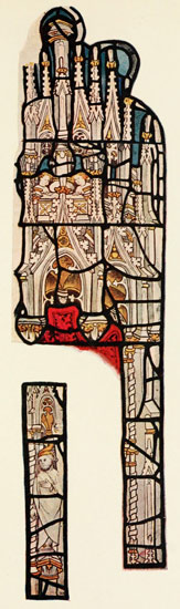 The new point of view naturally affected the canopy, which is shaded like solid stone-work, giving it a heavy and clumsy effect. In many of the subject windows, however, the canopy is omitted altogether, the sky of the picture, which is sometimes white, with clouds and circling swifts painted on it, continuing right up to the stone-work.