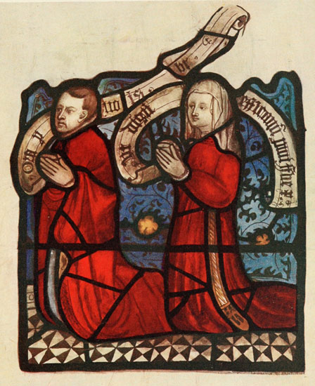 Below are the donors, Nicholas Blackburn, twice Mayor of York, and his wife Margaret (Plate XXXVI.), facing his son, also named Nicholas, and his wife, also named Margaret. The window has unfortunately been a good deal restored, and the background to the Blackburns is modern and was, I should think, originally blue. Modern, too, is the vivid green of the younger Nicholas's cloak. Margaret Blackburn, the elder, carries a book with the words, "Domine, labia mea aperies et os meum." The same verse occurs also, if I remember right, in a lady's hand at Selby Abbey. Were Yorkshire women, one wonders, so very silent?