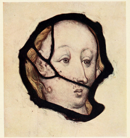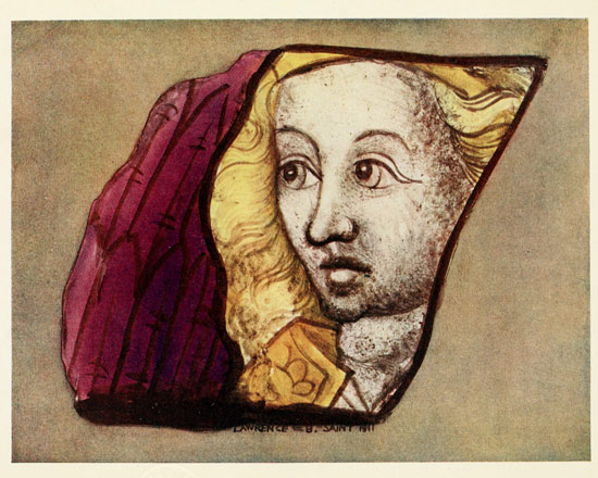It was not, however, till the second half of the century that any new life came into French stained-glass work, and when it came it brought with it a skill in picture-making that was borrowed from contemporary painting. To this period belong, I think, the fragments from Rouen shown in Plates XLV. to XLIX. The heads of St. Catherine and the old man, if compared with those from York, show the strong difference in facial 248 type between French and English work at this time. The stain on the hair of St. Catherine is very coarse and inartistic as compared with English work, but then no other nation ever equalled the English in their delicate and refined use of stain.