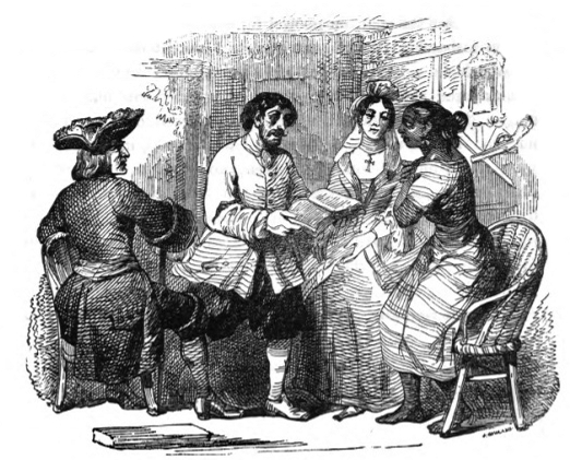 Terwijl zij aldus rustig voortleefden, kwamen de drie schurken, en dat nog wel hunne landslieden waren, bij hen, alleen uit lust om hen te schelden en te beschimpen. Zij zeiden, dat het eiland hun toebehoorde, dat de gouverneur, waarmede zij mij bedoelden, hen in het bezit er van gesteld had, en niemand anders er eenig regt op had, terwijl zij onder afgrijsselijke vloeken betuigden, dat zij op hunnen grond geene huizen zouden bouwen zonder er belasting voor te betalen.