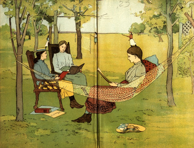 The girls sat round the room chatting and eating; Flora and Julia were on the bed, when Marion, who was at the front window, jumped up on the seat, and called out: "O Flo! Julie! do come here! Just look at this man coming down the street. Such a swell!"
