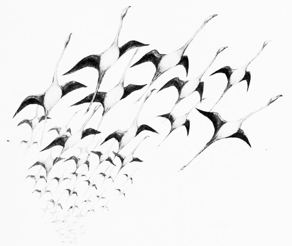 [6] By their peculiar style of aviation these birds, swaying up and down and swerving on zigzag courses, alternately expose a scintillating crimson mass suddenly flashing into a cloud of black and rosy white—according as their brilliant wing-plumage or their white bodies are presented to the eye. “A flame of fire” is the Arab signification of their name flamenco.