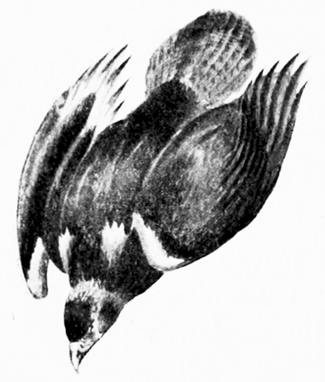 In the illustration of wild-life our views are also, in some degree, divergent from current ideas. Animal-photography has developed with such giant strides and has taught us such valuable lessons (for which none are more grateful than the Authors), that there is danger of coming to regard it, not as a means to an end but as the actual end itself. While photography promises uses the value of which it would be difficult to exaggerate, yet it has defects and limitations which should not be ignored. First as regards animals in motion; the camera sees too quick—so infinitely quicker than the human eye that attitudes and effects are portrayed which we do not, and cannot see. Witness a photograph of the finish for the Derby. Galloping horses do not figure so on the human retina—with all four legs jammed beneath the body like a dead beetle. No doubt the camera exhibits an unseen phase in the actual action and so reveals its process; but that phase is not what mortals see. Similarly with birds in flight, the human eye only catches the form during the instantaneous arrest of the wing at the end of each stroke—in many cases not even so much as that. But the camera snaps the whirling pinion at mid-stroke or at any intermediate point. The result is altogether admirable as an exposition of the mechanical processes of flight; but it fails as an illustration, inasmuch as it illustrates a pose which Nature has expressly concealed from our view.