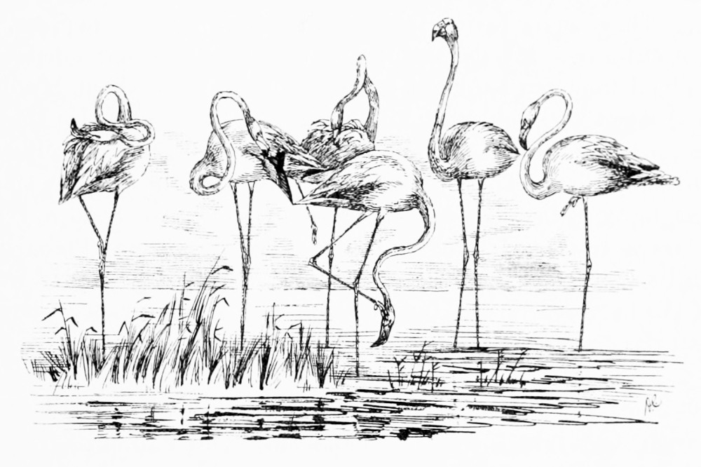[51] It is right to add that in America the growth of mangrove and other bushes, sometimes in close proximity to the nests, offers facilities to the photographer that are wholly wanting in Spain, where the flamingo only nests in perfectly open waters devoid of the slightest covert or means of concealment.
