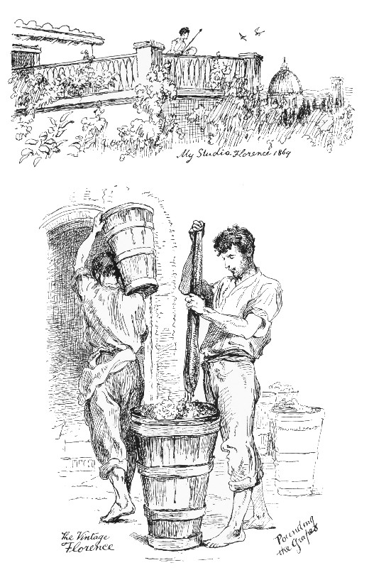 A nice couple of children we were sometimes! At this same Nervi, one day, we little girls found the village people celebrating a festa at Sant’ Ilario, high up on the foothills of the mountains behind our house. We mixed in the crowd outside, as the church emptied, and armed ourselves with branches. Rounding up the children, who were in swarms, we gave chase. Down, down, through the zone of chestnut trees, down through the olive woods, down through the vineyards, down to the little town the throng fled, till, landing them in the street, we went home, remarking on the evident superior power of the Anglo-Saxon race over the Latin.