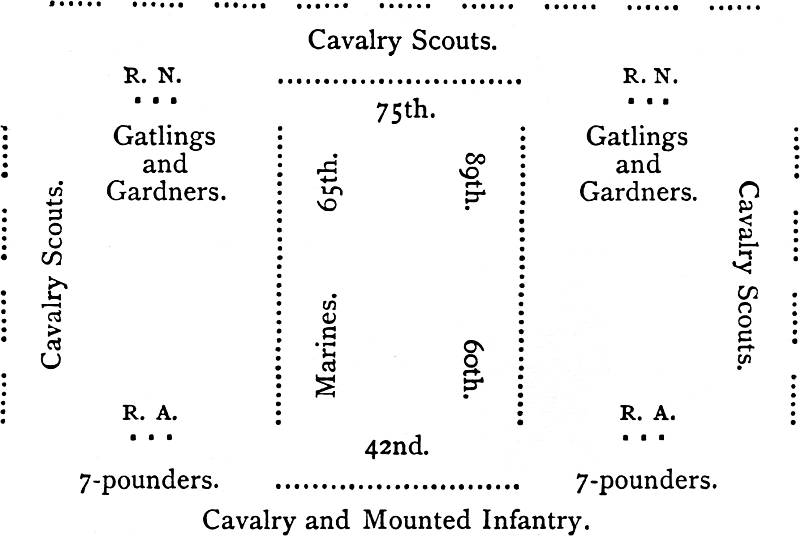 [109] There was something anomalous in placing heavy cavalry in an infantry square, a formation altogether contrary to the spirit of their training and traditions. Notwithstanding this, the behaviour of the force in the mêlée which ensued, and the steadiness which enabled the square to be re-formed under circumstances which rendered disaster possible, were worthy of the finest traditions of the British Army.