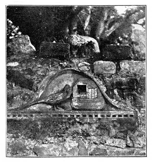 This quaint sculptured stone is now included with many other fragments, evidently of some church, in a wall in Appleby, Westmorland. At first one wonders how the dove—who has unfortunately lost her head—ever managed to leave the ark either by the window or by the magnificent iron-plated door, but this wonder gives place to amazement when one notices the size of the patriarch's hand (seen through the window), and commences to speculate on how he, his children, and the animals find accommodation for their grand proportions in this small boat; the problem of packing them would tax the ingenuity of a sardine-merchant. Photo. sent in by Mr. A. S. Reid, Trinity College, Glenalmond.