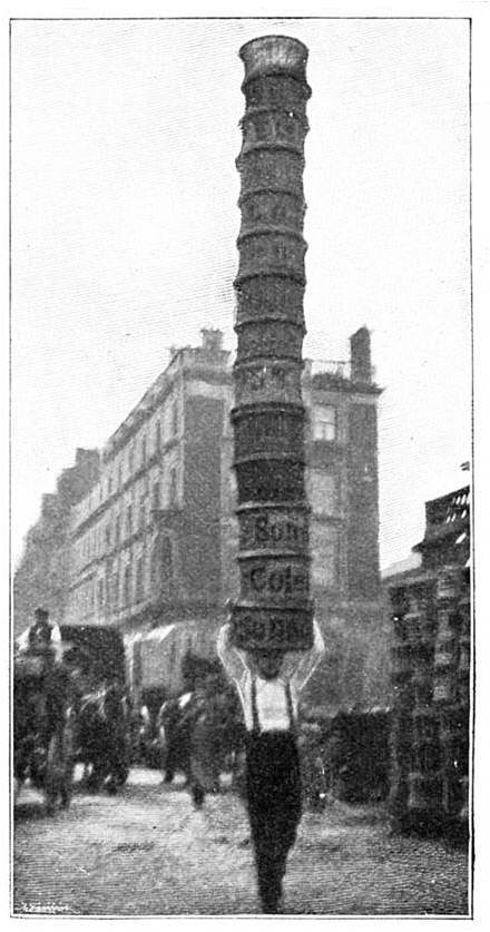 The gentleman seen in this excellent little snap-shot is a Covent Garden porter, and he is carrying the fourteen bushel baskets seen in our photo. in the execution of his ordinary duties. The baskets make a column of some 196in., or 16ft. 4in. Add 5ft. 10in. as the height of the carrier, and you get a walking column 22ft. 2in. high. The carrying of these baskets was not done for a wager. There is room for speculation as to what would have been the result of the sudden advent of a runaway horse. Photo. by Mr. W. B. Northrop, 36, Essex Street, Strand, W.C.
