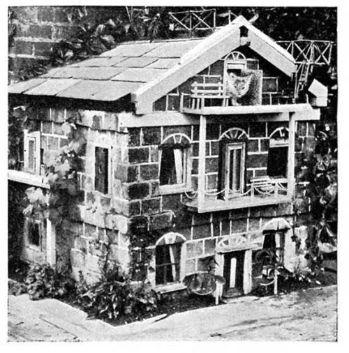 The luxurious little mansion seen in the accompanying reproduction is built of bricks cut to about one-fourth of their usual size, and the windows are of glasses fitted into wooden frames in the usual manner. There are four rooms—each with plastered walls and carpeted floor—and a "practicable" stair-case leads to the first and second floors. The house was built by Stanley Barlow, a son of the Moravian minister of Leominster, as a residence for his two cats, who have lived in it for more than a year, making good use of all the arrangements for their comfort, and apparently quite proud of their unique little domicile. The building is 4ft. 5in. high, and 4ft. broad, and boasts the name of "Tunnicliffe Villa," the owner being an enthusiastic admirer of the Yorkshire batsman. Photo. sent in by Mr. Alf. Death, of Fern Cottage, Leominster.