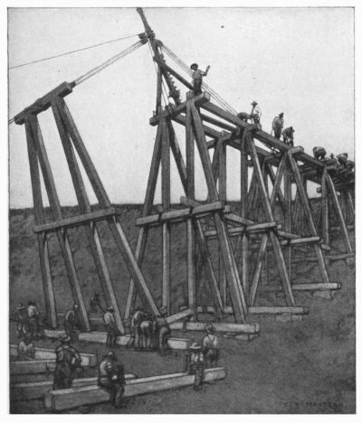 Young Van flushed at this, but followed the chief out to the long street along which straggled the buildings that made up the settlement. These buildings were mostly saloons, each with its harvest of plainsmen, cowboys, laborers, and outcasts standing, sitting, or sprawling before the door. The day was hot with the dry heat of September, from which even the memory of moisture had long ago been sucked out. The dust rose at every step and settled on skin and clothing. Now and then a lounging figure rose and moved languidly in through a saloon door. Almost the only other movement to be seen was the heat vibration in the atmosphere. The only sound, beyond a drawled[Pg 302] remark now and then, and the clink of glasses, was the tinkle of a crazy piano down the street. But the bronzed, sinewy engineers, who had for months known no other atmosphere, stepped off in a swinging stride, and soon were past the end of the street and out in the open. Carhart himself was not above a sense of elation, and he fell into reminiscence.