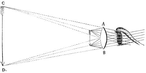 Referring to Fig. 3, it will be observed that if the eye could see the small arrow at the distance there shown without the intervention of the lens, only a very small portion of the cones of light drawn from its extremities would enter the pupil; whereas we have supposed that after being bent by the lens the whole of this light enters the eye as part of the cones of smaller angle whose summits are at C and D. These cones will further[Pg 10] explain the difference between large and small pencils of light; those from the small arrow are large pencils; the dotted cones from the large arrow are small pencils.