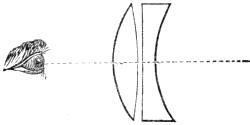 Another very useful form of doublet was proposed by Sir John Herschel, chiefly like the Coddington lens, for the sake of a wide field, and chiefly to be used in the hand. It is shown in Fig. 9; it consists of a double convex or crossed lens, having the radii of curvature as 1 to 6, and of a plane concave lens whose focal length is to that of the convex lens as 13 to 5.