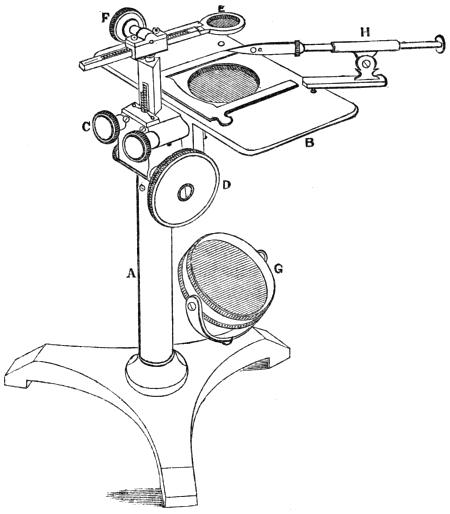 One of the best forms of a stand for a simple microscope is shown in Fig. 10, where A is a brass pillar screwed to a tripod base; B is a broad stage for the objects, secured to the stem by screws, whose milled heads are at C. By means of the large milled head D, a triangular bar, having a rack, is elevated out of the stem A, carrying the lens-holder E, which has a horizontal movement in one direction, by means of a rack worked by the milled head F, and in the other direction by turning on a circular pin. A concave mirror G reflects the light upwards through the hole in the stage, and a lens may be attached to the stage for the purpose of throwing light on an opaque object, in the same way that the forceps H for holding such objects is attached. This microscope is peculiarly adapted, by its broad stage and its general steadiness, for dissecting; and it is rendered more convenient for this purpose by placing it between two inclined planes of mahogany, which support the arms and elevate the wrists to the level of the stage. This apparatus is called the dissecting rest. When dissecting is not a primary object, a joint may be made at the lower end of the stem A, to allow the whole to take an inclined position; and[Pg 17] then the spring clips shown upon the stage are useful to retain the object in its place. Numerous convenient appendages may be made to accompany such microscopes, which it will be impossible to mention in detail; the most useful are Mr. Varley’s capillary cages for containing animalculæ in water, and parts of aquatic plants; also his tubes for obtaining and separating such objects, and his phial and phial-holder for preserving and exhibiting small living specimens of the Chara, Nitella, and other similar plants, and observing their circulation. The phial-microscope affords facilities for observing the operations of minute vegetable and animal life, which will probably lead to the most interesting discoveries. The recent volumes of the Transactions of the Society of Arts contain an immense [Pg 18]mass of information of this sort, and to these we refer the reader.