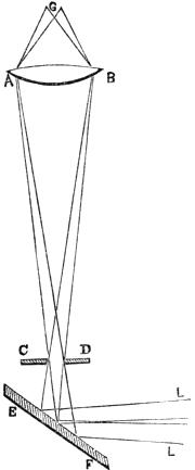 But the principal question in regard to illumination is the magnitude of the illuminating pencil, particularly in reference to transparent objects. Generally speaking the illuminating pencil should be as large as can be received by the lens, and no larger. Any light beyond this produces indistinctness and glare. The superfluous light from the mirror may be cut off by a screen having various-sized apertures placed below the stage; but the best mode of illumination is that proposed by Dr. Wollaston, and called the Wollaston condenser. A tube is placed below the stage of the instrument containing a lens A B (Fig. 11), which can be elevated or depressed within certain limits at pleasure; and at the lower end is a stop with a limited aperture C D. A plane mirror E F receives the rays of light L L from the sky or a white cloud, which last is the best source of light, and reflects them upwards through the aperture in C D, so that they are refracted, and form an image of the[Pg 19] aperture at G, which is supposed to be nearly the place of the object. The object is sometimes best seen when the image of the aperture is also best seen; and sometimes it is best to elevate the summit G of the cone A B G above the object, and at others to depress it below: all which is done at pleasure by the power of moving the lens A B. If artifical light (as a lamp or candle) be employed, the flame must be placed in the principal focus of a large detached lens on a stand, so that the rays L L may fall in parallel lines on the mirror, or as they would fall from the cloud. This will be found an advantage, not only when the Wollaston condenser is employed, but also when the mirror and diaphragm are used. A good mode of imitating artificially the light of a white cloud opposite the sun has been proposed by Mr. Varley; he covers the surface of the mirror under the stage with carbonate of soda or any similar material, and then concentrates the sun’s light upon its surface by a large condensing lens. The intense white light diffused from the surface of the soda forms an excellent substitute for the white cloud, which, when opposite the sun, and of considerable size, is the best daylight, as the pure sky opposite to the sun is the worst.