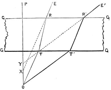 “The aberration produced with diverging rays by a piece of flat and parallel glass, such as would be used for covering an object, is represented at Fig. 17, where G G G G is the refracting medium, or piece of glass covering the object O; O P, the axis of the pencil, perpendicular to the flat surfaces; O T, a ray near the axis; and O T´, the extreme ray of the pencil incident on the under surface of the glass; then T R, T´ R´, will be the directions of the rays in the medium, and R E, R´ E´, those of the emergent rays. Now if the course of these rays is continued, as by the dotted lines, they will be found to intersect the axis at different distances, X and Y, from the surface of the glass; and the distance X Y is the aberration produced by the medium which, as before stated, interferes with the previously balanced aberrations of the several lenses composing the object-glass.[Pg 33] There are many cases of this, but the one here selected serves best to illustrate the principle. I need not encumber the description with the theoretical determination of this quantity, as it varies with exceedingly minute circumstances which we cannot accurately control; such as the distance of the object from the under side of the glass, and the slightest difference in the thickness of the glass itself; and if these data could be readily obtained, the knowledge would be of no utility in making the correction, that being wholly of a practical nature.
