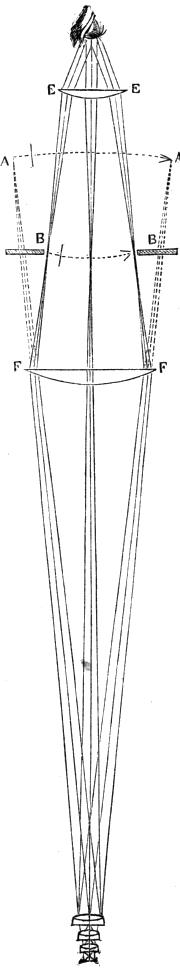 The arrangement is shown in Fig. 21, where E E and F F are the eye and field glass, the latter having now its plane face towards the object. The rays from the object are here made to converge at A A, immediately in front of the field-glass, and here also is placed a plane glass on which are engraved divisions of a hundredth of an inch or less. The markings of these divisions come into focus therefore at the same time as the image of the object, and both are distinctly seen together. Thus the measure of the magnified image is given by mere inspection, and the value of such measures in reference to the real object may be obtained thus, which, when once obtained, is constant for the same object-glass. Place on the stage of the instrument a divided scale the value of which is known, and viewing this scale as the microscopic object, observe how many of the divisions on the scale attached to the eye-piece correspond with one of those in the magnified image. If, for instance, ten of those in the eye-piece correspond with one of those in the image, and if the divisions are known to be equal, then the image is ten times larger than the object, and the dimensions of the object are ten times less than indicated by the micrometer. If the divisions on the micrometer and on the magnified scale were not equal, it becomes a mere rule-of-three sum, but in general this trouble is taken by the maker of the instrument, who furnishes a table showing the value of each division of the micrometer for every object-glass with which it may be used.