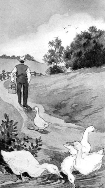 “I fear he does not know very much,” said the Drake, sadly, “although I must say that I like his face. He looks good and kind, not at all as though he would ever throw stones at people for the fun of seeing them waddle faster. What I do not like is the way in which he acted about getting his water. Any Duck knows that you can tell most about people by the way they take water. The old gourd which the Farmer and his family used so long, hung right on the chain-pump, and yet this Man got a glass and filled it. He did not even drink from it as soon as it was full, but filled and emptied it three times before drinking. That is not what I call good sense.”