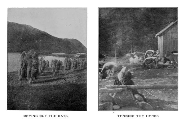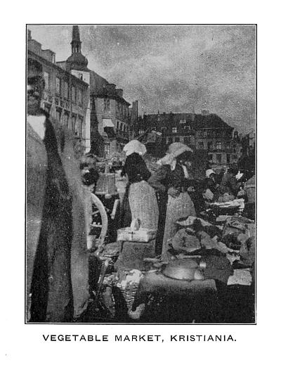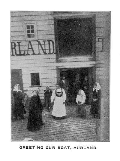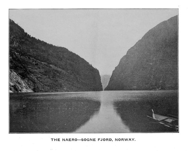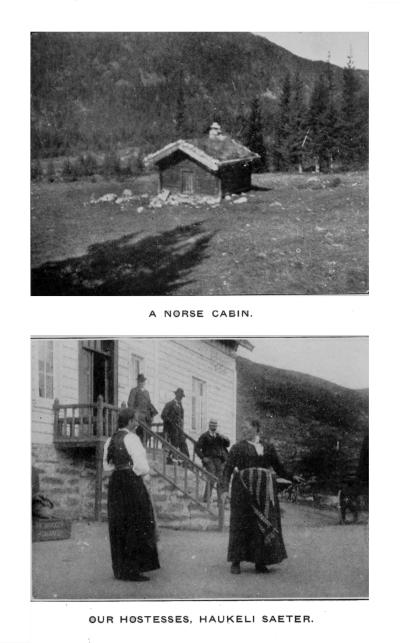 Crossing the market square to a long, low building, which somehow had about it that indefinable air suggestive of a breakfast comfortably cooked, we came to an inn, in the low-ceilinged dining room of which were little tables set about upon the sanded floor. Two or three men of the sea were smoking in one corner, a bar and a red-cheeked barmaid were in another, and two huge, yellow, Great-Dane dogs occupied most of the remaining space. We chose a table by the window and H ordered roed spoette, rolls and coffee. The fish was delicious, possessing a harder, sweeter flesh than the English sole; and rolls with salted butter rejoiced my palate, for I am dreadfully tired of English butter with no salt; and then we were given big brown pancakes with currant jelly, all we could eat. It was a breakfast fit for a Viking. The bill was only three kroner and twenty oere, which equals about eighty-six cents.