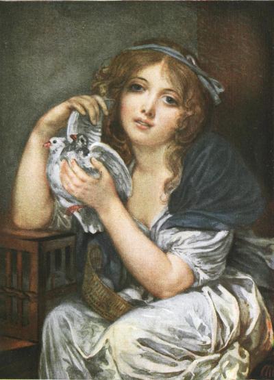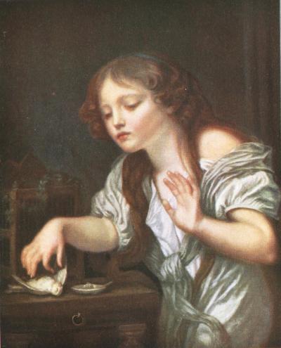 “L’Oiseau Mort,” or “The Dead Bird,” bequeathed by Baron Arthur de Rothschild to the Louvre, shows one of Greuze’s most beautiful child-figures, a little girl who has just found her bird dead. You forget the mannered pose of the hands and arms, to admire their curves and dimples. The delicacy of the little grieving face is beyond praise, with the tears starting beneath the downcast lashes, and a mouth that seems to quiver under the stir of shadow that plays round it.