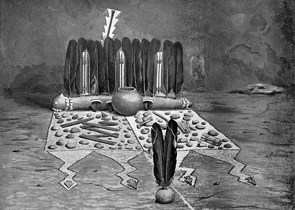 Anote's medicine-bowl was set just in front of the middle rain-cloud figure; the clay pedestal with inserted upright feathers stood before the left, and a basket-tray with prayer-meal before the right rain-cloud figure.