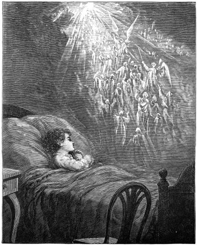 Now, these rays were so bright, and they seemed to make such a shining way from earth to heaven, that when the child went to his solitary bed, he dreamed about [Pg 9]the star; and dreamed that, lying where he was, he saw a train of people taken up that sparkling road by angels. And the star, opening, showed him a great world of light, where many more such angels waited to receive them.