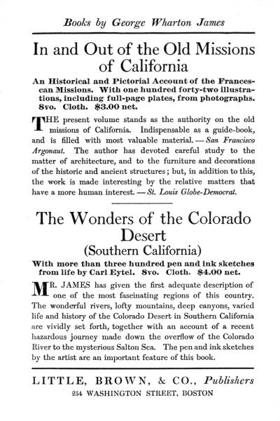 Mr. James has given the first adequate description of one of the most fascinating regions of this country. The wonderful rivers, lofty mountains, deep canyons, varied life and history of the Colorado Desert in Southern California are vividly set forth, together with an account of a recent hazardous journey made down the overflow of the Colorado River to the mysterious Salton Sea. The pen and ink sketches by the artist are an important feature of this book.