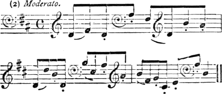 Any pianist of ordinary ability would be able to play the above passage at sight, without the slightest difficulty, and according to theory it is correctly written. Now, if written for the violoncellist in one stave, according to the same rules, it would be extremely difficult to read at sight, the abrupt changes of clef being very confusing.