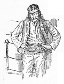 When the boat was out, Mr. Hayward and Mr. Hallett, two of the midshipmen, and Mr. Samuel, were ordered into it. I demanded what their intention was in giving this order, and endeavored to persuade the people near me not to persist in such acts of violence; but it was to no effect. Christian changed the cutlass which he had in his hand for a bayonet that was brought to him, and holding me with a strong grip by the cord that tied my hands, he with many oaths threatened to kill me immediately if I would not be quiet; the villains round me had their pieces cocked and bayonets fixed. Particular people were called on to go into the boat, and were hurried over the side, whence I concluded that with these people I was to be set adrift. I therefore made another effort to bring about a change, but with no other effect than to be threatened with having my brains blown out.