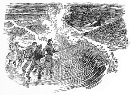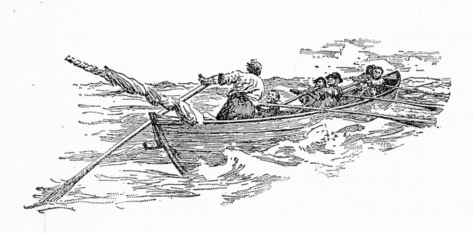The tide was flowing, which was a great help to the young oarsmen. We emerged from the wreck and glided into the open sea. All eyes were strained to get a full view of the land, and the boys pulled with a will; but for some time we made no progress, as the boat kept turning round and round, until I hit upon the right way to steer it, after which we merrily made for the shore.