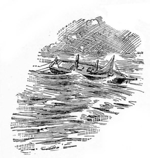 My first impulse was one of despair, but my second was towards joy. Round she came, till she was broadside on to me—round still till she had covered a half, and then two-thirds, and then three-quarters of the distance that separated us. I could see the waves boiling white under her forefoot. Immensely tall she looked to me from my low station in the coracle.