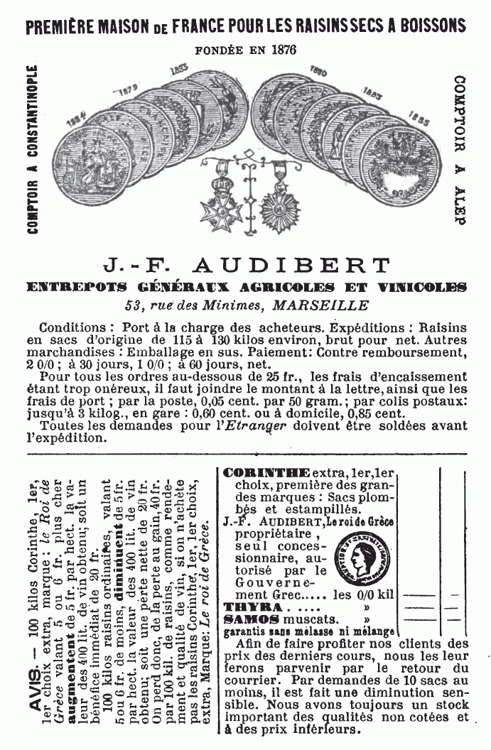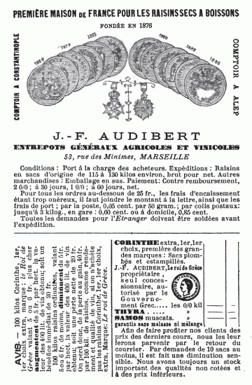 [5] Le dépôt de ces raisins, les seuls qu’on doit employer pour être certain de la qualité, et surtout du rendement est aux entrepôts généraux Agricoles et Vinicoles, 53, rue des Minimes, Marseille.