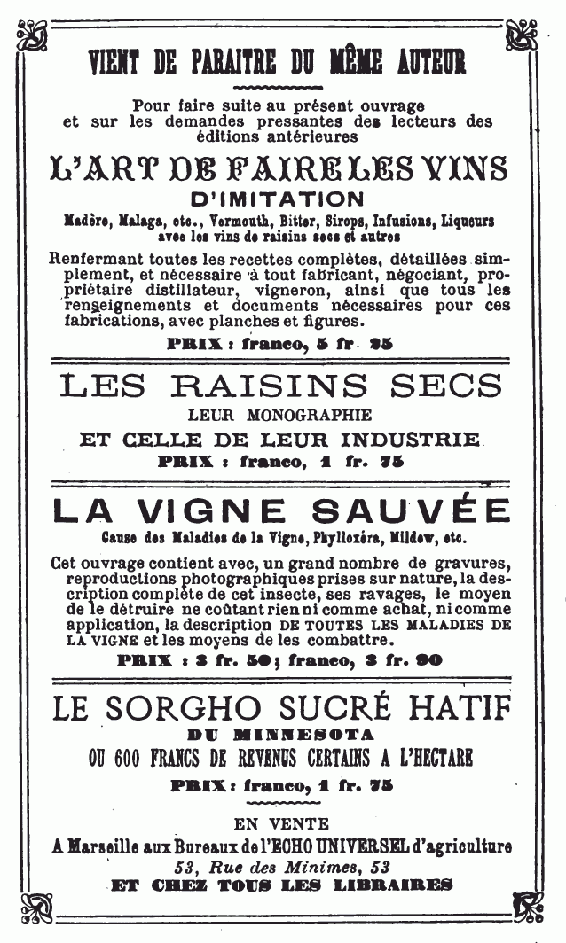 [31] Chaque année, à l’époque des vendanges, je donne, dans l’Echo Universel, journal agricole et vinicole que je dirige, tous les renseignements nécessaires pour tripler la récolte de vin. (Bureaux à Marseille).