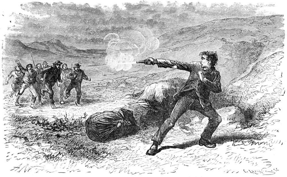 Il n’est pas étonnant qu’un lieu exerçant de si puissantes séductions sur les chercheurs d’or ait été, dès l’origine, le rendez-vous des coquins les plus audacieux du monde entier. Le revolver et le «bowie-knife» (sorte de long couteau-poignard) commençaient les querelles et les terminaient, et la justice, rendue du reste par les agresseurs, n’était qu’une cruelle dérision.