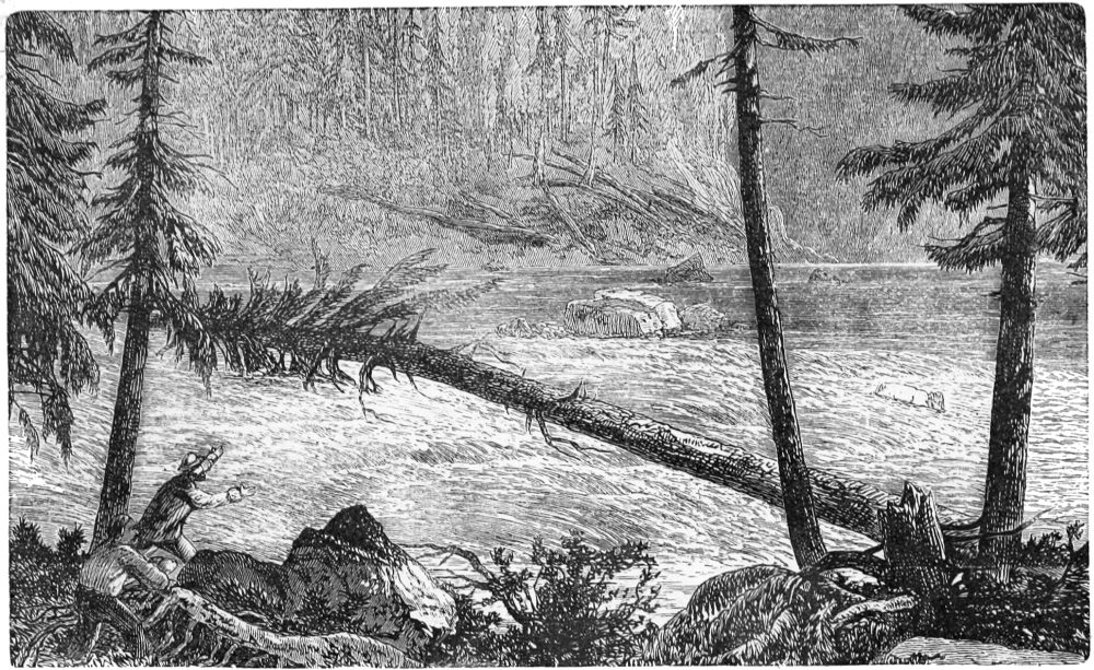 Le premier jour, le chemin fut assez praticable; mais les deux jours suivants il devint très-mauvais; nous ne pûmes faire qu’une douzaine de milles, et malgré cela nos pauvres animaux étaient horriblement fatigués. Nous arrivâmes enfin à un endroit situé à deux milles au-dessus de notre creek, sur le bord opposé du cours d’eau principal. Pendant notre absence, la neige avait fondu dans le haut pays et la rivière avait repris son niveau habituel: nous n’éprouvâmes aucune difficulté à construire un radeau. Nous eûmes deux ou trois traversées à faire pour transporter nos animaux et nos provisions de l’autre côté, ce qui, avec les allées et venues, nous prit encore quelques jours.