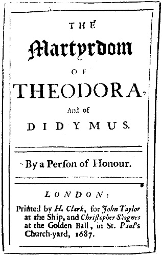 Having had occasion many years ago to turn over a Martyrology, and some other Books, that related to the Sufferings of the Primitive Christians; I chanc’d to light on those of a Virgin, who, though (to my wonder) she was left unnam’d by the other Writers that mentioned her, seem’d plainly to be the same, that is by one of them expresly call’d Theodora: I own, I was not a little affected, at the reading of such moving and uncommon adventures as hers: and finding her story to be related, by the Author that nam’d both her and her Lover, not only very succinctly and imperfectly, but very dully too; I found my self tempted so to enlarge this Story, as that it might be contriv’d into a somewhat voluminous Romance: But upon second thoughts, it appeared incongruous to turn a Martyr into a Nymph or an Amazon: And I consider’d too, that (to omit what else might be objected against that sort of Composures) as true Pearls are Cordials and Antidotes, which counterfeit ones, how fine soever they may appear, are not; so True Examples do arm and fortify the mind far more efficaciously, than Imaginary or Fictitious ones can do; and the fabulous labours of Hercules, and Exploits of Arthur of Britain, will never make men aspire to Heroick Vertue half so powerfully, as the real Examples of Courage and Gallantry afforded by Jonathan Cæsar, or the Black Prince. But yet, thinking it great pity, that so shining a Vertue as Theodora’s should prove Exemplary, but to her own time, and to one City; and remembring, that soon after the Age which she Ennobl’d, it was counted among the Primitive Christians an act of Piety, to build fair Monuments, upon the formerly abject Graves of the Martyrs; to repay, by Honours done to their Memories, the indignities and Disgraces they had suffer’d in their Persons; I thought fit to try, if I could rescue from more unskilful Hands than even mine, a story that abundantly deserv’d to be well told.
