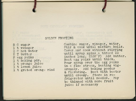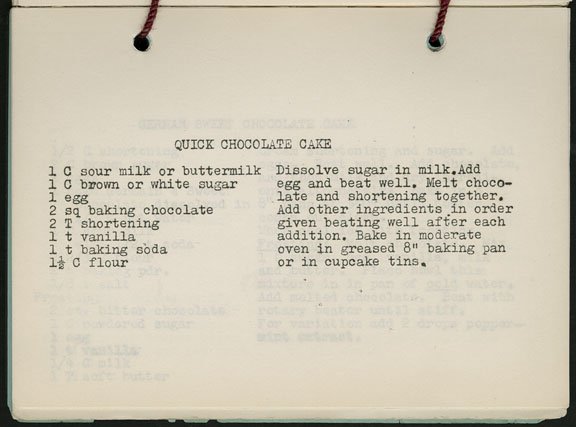 Frosting: Melt chocolate. Mix 1 C sugar, egg, vanilla, milk and butter. Place bowl this mixture in pan of cold water. Add melted chocolate. Beat with rotary beater until stiff. For variation add 2 drops peppermint extract.