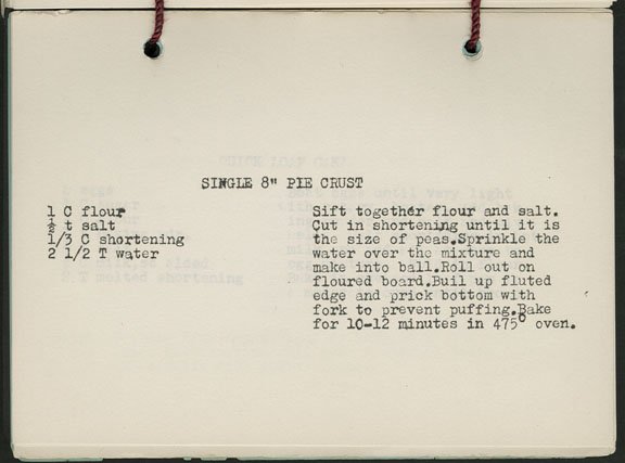 Cut shortening into sifted dry ingredients. Add ice water and work quickly into a ball of dough. Wrap in wax paper and towel and place in refrigerator.