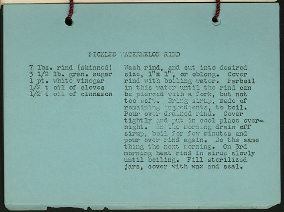 Wash rind, and cut into desired size, 1"✕1", or oblong. Cover rind with boiling water. Parboil in this water until the rind can be pierced with a fork, but not too soft. Bring sirup, made of remaining ingredients, to boil. Pour over drained rind. Cover tightly and put in cool place overnight. In the morning drain off sirup, boil for few minutes and pour over rind again. Do the same thing the next morning. On 3rd morning heat rind in sirup slowly until boiling. Fill sterilized jars, cover with wax and seal.