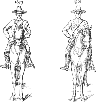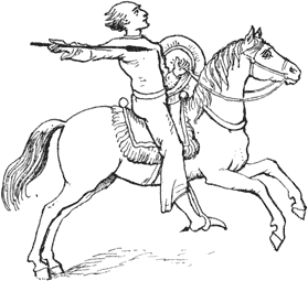 Chaucer described “The Wife of Bath” as wearing “on her feet a paire of spurries sharpe.” From this we may judge that she also adopted a cross saddle, and as a matter of fact in the Elesmere MSS. we find a picture of her, showing that she rode astride, and was dressed in a curious garment like a divided bag. On the Continent, ladies who go shooting very often dress like their husbands, and a year or two ago the American newspapers were full of accounts of a lady who imitated the riding costume of a hunting man to the smallest detail. Apropos of this, The Field61 told an amusing story of an English lady who in a measure unintentionally forestalled our American cousins, for after she had had the best part of her habit carried away by some aggressive brambles, she was seen scudding after her horse in a pair of real top boots.
