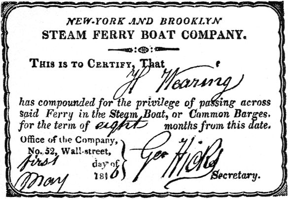 | Early Ferry Advertisement. (From Historical Sketch of Fulton Ferry and its Associated Ferries, 1879) | Facing page | 28 |
