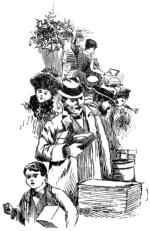 It said no more. Mr. Broadstreet, who, when a child, had often longed to peep behind a picture, found himself actually fulfilling his wish. As he drew nearer the printed page, he heard a dull roar, like surf beating upon a rocky coast. He advanced further, picking his way around the pile of poultry and vegetables and glistening holly upon which the Ghost sat enthroned. A moment more and the room vanished in utter blackness of night, the roar grew grander and deeper, until it throbbed in his ears like the diapason of a mighty organ, a fierce blast of snow-laden wind struck his bewildered face, the street-lamp upon the corner flickered feebly in a mist of flakes—he was standing before his own door, knee-deep in a snow-drift, and buffeted above, below, and on every side by the storm that was abroad that Christmas Eve.