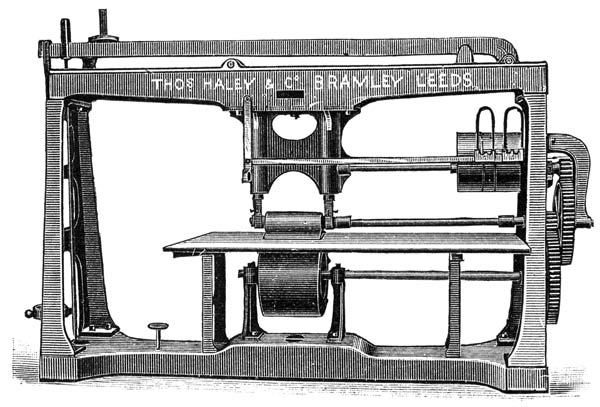 When the leather is completely dried, it may be sold at once, but if, as is generally the case, a special "nap" finish is required on the flesh side, the hides are placed in damped deal sawdust until they are in the right condition of flexibility for the next process, known as "fluffing." This is done on a rapidly revolving wheel (Fig. 33) covered with emery powder varying in the size of grain according to the effect desired on the finished leather. The abrasion of the leather on the flesh (i.e., the under side) raises a soft nap. Carborundum, a special abrasive made in America, by the fusion of sand, coke, and salt at a very high temperature, has to some extent supplanted the use of emery. As a 129 final finish, the flesh side may be rubbed over with chalk or china clay to give it a clear saleable appearance.