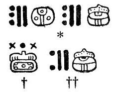 [226] This Secondary-series number is doubly irregular. In the first place, the kin and uinal coefficients are reversed, the latter standing to the left of its sign instead of above, and in the second place, the uinal coefficient, although it is 14, has an ornamental dot between the two middle dots.
