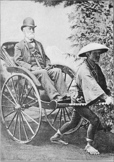Last evening our party started for a moonlight excursion along the smooth and finely macadam-paved streets of the city. Under the guidance of one of our number, jinrickishas—the national cab for transporting light packages and passengers—were called, The translation of this word is pullman-car, and thus we have the extraordinary coincidence of the same name for a crude vehicle, drawn by a man, and for the splendid Pullman palace cars of America, which, with the Wagner, so far surpass in elegance and comfort all others.