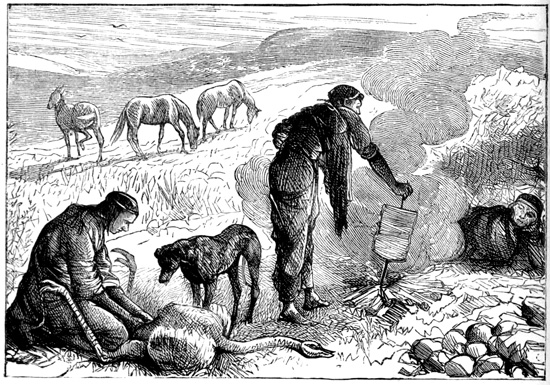 The recipe for making a pair of potro boots is very simple, and the operation requires no previous knowledge of the cobbler's art. Having killed your horse, you make an incision with a sharp knife round the hide above the hock, say at the commencement of the lower thigh, and another a couple of inches below the curb-place, and then proceed to draw the hide off the legs. Each leg will thus supply a comfortable Wellington, in which the point of the hock has become the heel. Of course, before fit for wear, the hide must be well softened by hand—a task which requires no little patience; for if not thoroughly done, the boots after a time will become quite hard and useless. As soon as they have been worn long enough to have taken the shape of the foot, the toe-ends are sewn up, and the transformation of your horse's hocks into easy-fitting boots is an accomplished feat. 39
