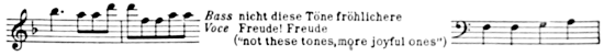 [166] The Royal Library acquired the autograph manuscripts of the instrumental movements of the Symphony from Schindler, and the choral part from the Artaria Collection of Vienna when it was dispersed by sale in 1901. The autograph is not intact, however, the coda of the Scherzo, consisting of four pages, having been given to Moscheles by Schindler on September 14, 1827. Moscheles in turn gave the relic to Henry Phillips. In July, 1907, it was purchased at a public sale by Mr. Edward Speyer, its owner at the present writing. The autograph of the Finale, too, had been mutilated, a page containing the five measures immediately preceding the Allegro energico, 6-4 time, with the words “Über Sternen muss er wohnen,” having been removed. It was sold by an autograph dealer of Berlin to Charles Malherbe, of Paris, who on his death bequeathed it to the Conservatoire. As published, the Allegro non tanto contains eight measures which Beethoven did not write in the autograph, but are, no doubt, an addition made by him in a revision. It would be a beautiful act of piety to assemble the autograph score and publish it in facsimile.