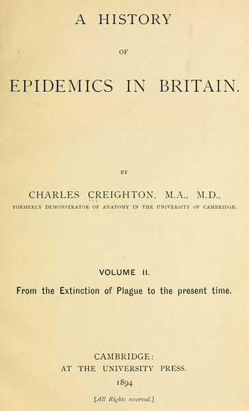 I have, unfortunately for my own labour, very few acknowledgements to make of help from the writings of earlier workers in the same field. My chief obligation is to the late Dr Murchison’s historical introduction to his ‘Continued Fevers of Great Britain.’ I ought also to mention Dr Robert Willan’s summary of the throat-distempers of the 18th century, in his ‘Cutaneous Diseases’ of 1808, and the miscellaneous extracts relating to Irish epidemics which are appended in a chronological table to Sir W. R. Wilde’s report as Census Commissioner for Ireland. For the more recent history, much use has naturally been made of the medical reports compiled for the public service, especially the statistical.
